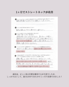デスクワークでストレートネックに悩んでおられましたが、週2回の2ヶ月間で軸が整いました。